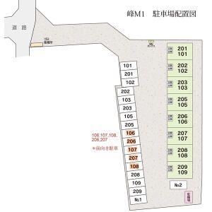 | 駐車場 | / ※2台目有料駐車場あり(月額3,300円)2区画のみ (注)106,107,108,206,207号室は前向き駐車 | ||